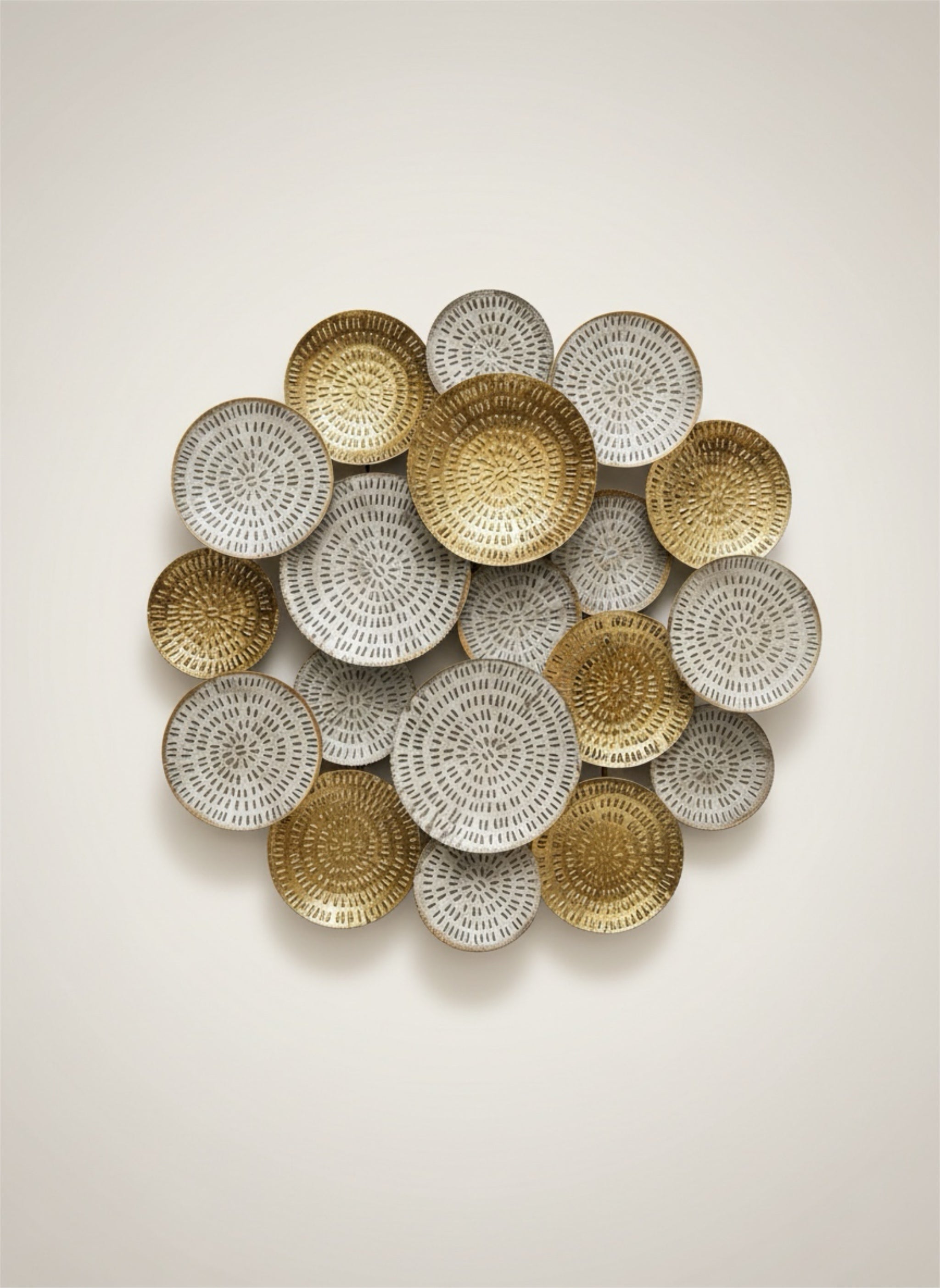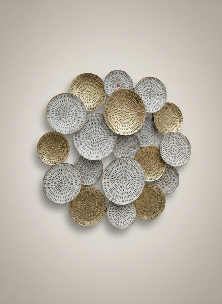 Modern tasarıma sahip metal dekoratif duvar tablosu. Altın ve gümüş tonlarının uyumuyla yaşam alanlarına şık ve sofistike bir görünüm kazandırır. Salon ve duvar dekorasyonu için ideal.