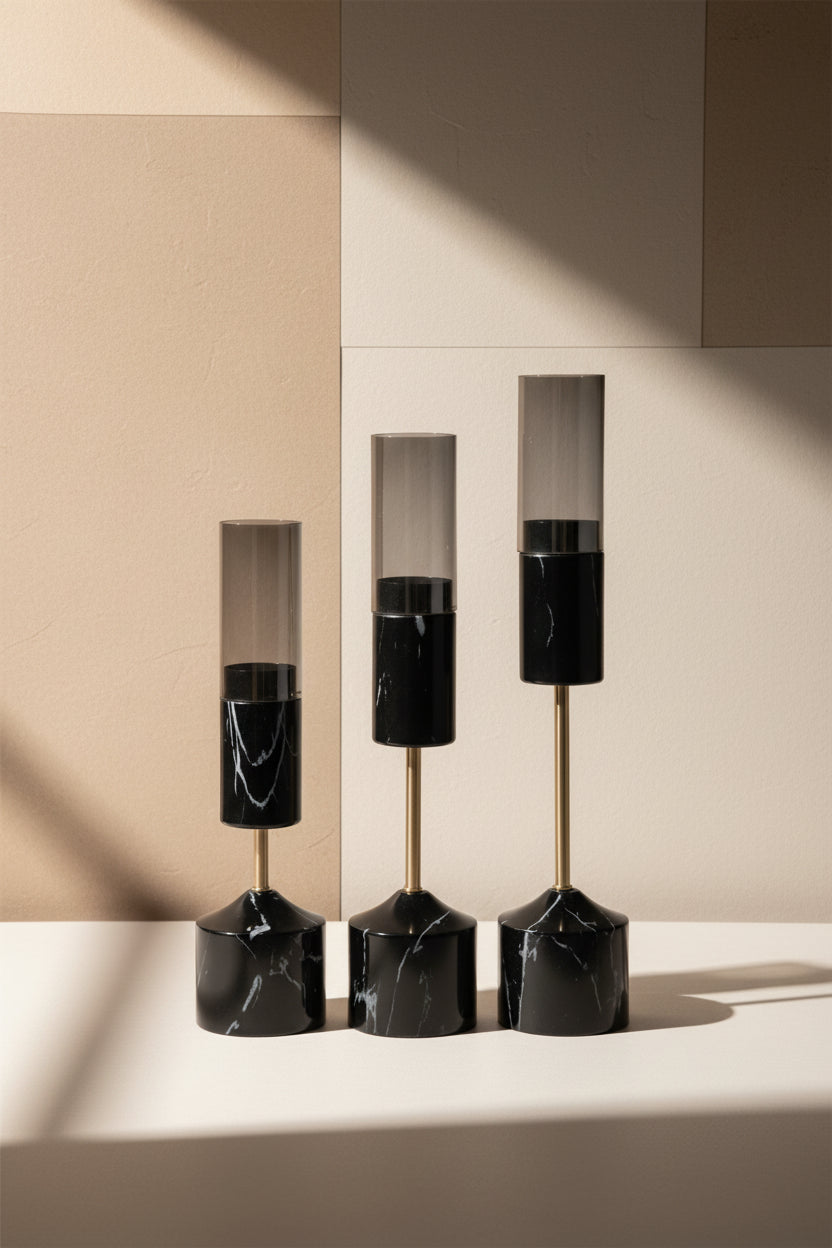 Modern ve zarif tasarıma sahip 3’lü siyah mumluk seti. Cam ve metal detaylarıyla yaşam alanlarına sofistike bir dokunuş katar. Sınırlı stok.