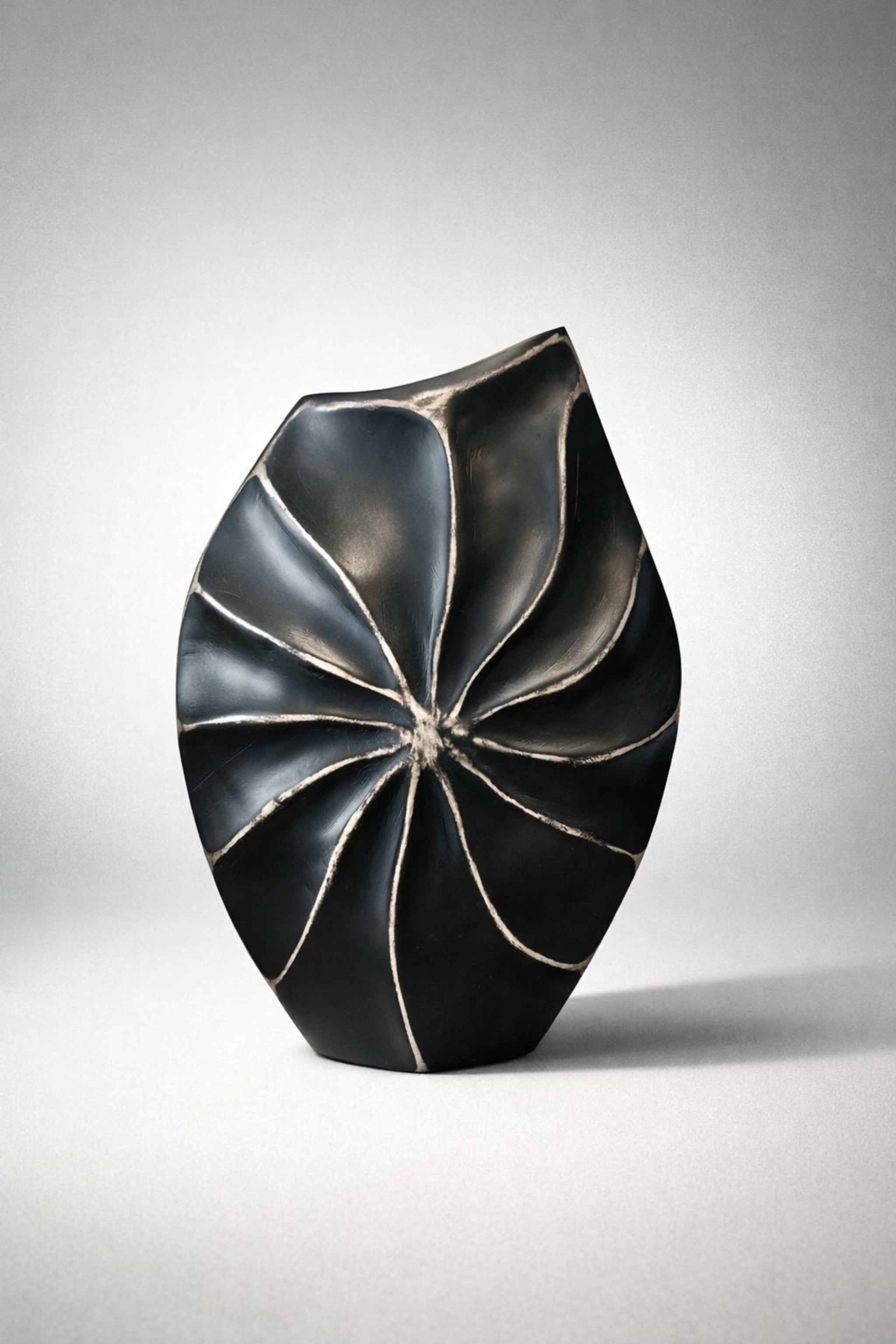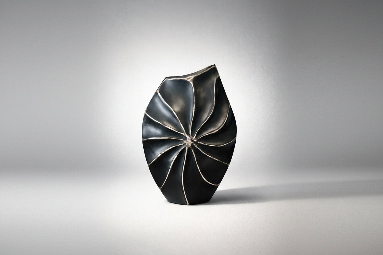 Siyah dokulu ve heykelsi formda dekoratif vazo. Modern ve güçlü tasarımıyla yaşam alanlarına sofistike bir karakter kazandırır. Sınırlı stok.
